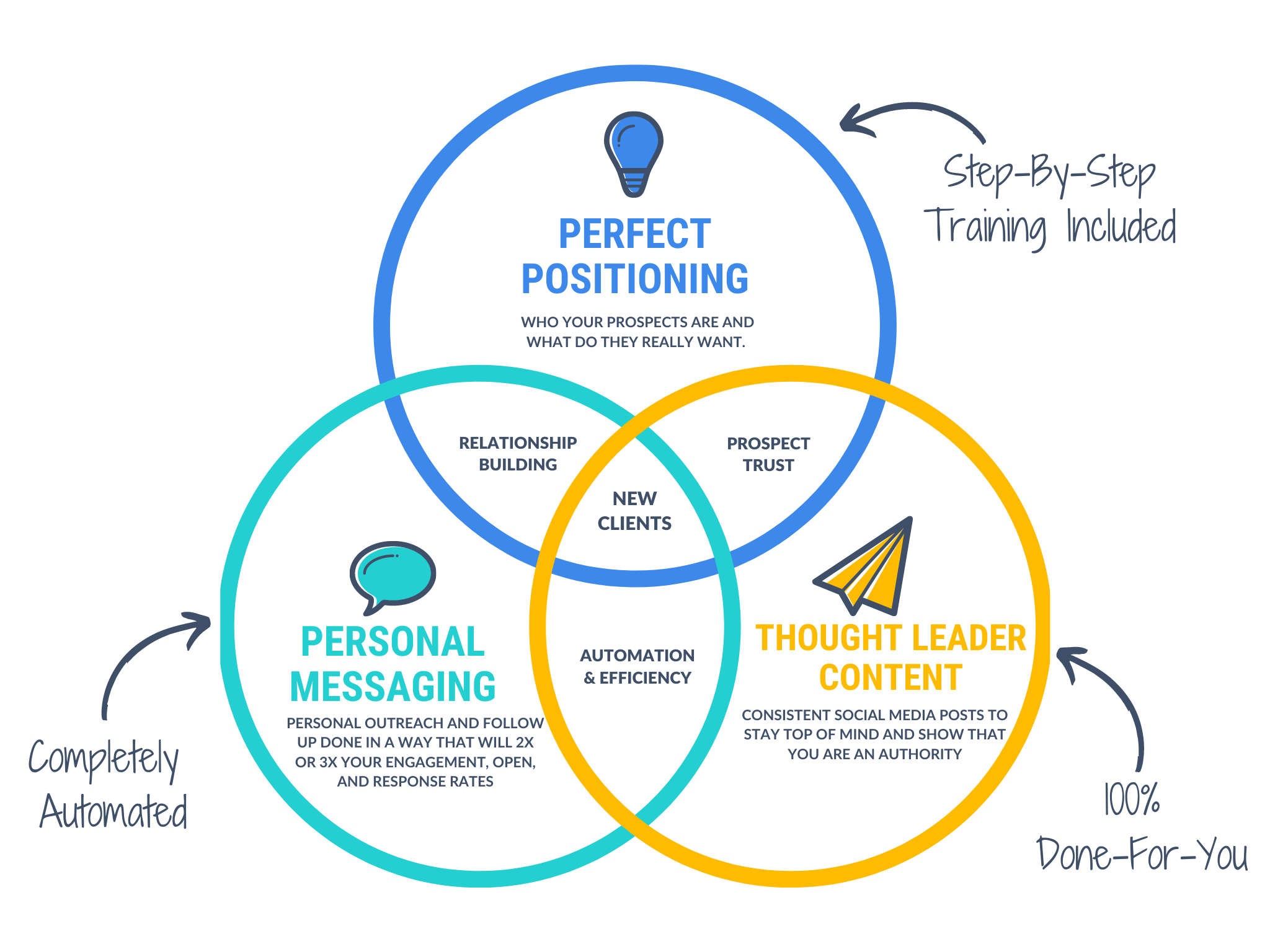 With The Lead Generator your audience will have a multifaceted client attraction system that leverages social media content and personal outreach to attract prospects, warm them up, earn their trust, and then turn them into paying clients... QUICKLY.